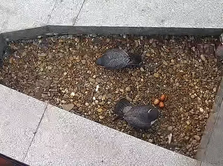 В этом году сапсаны вернулись на привычное место 24 марта. Этот сезон, по мнению орнитологов, стал самым тяжелым для соколиного семейства за все годы — самка прилетела в родные места с травмированной лапкой. Как и почему это произошло неизвестно. Птице сложно даже ходить, не говоря уже об охоте, на которую в период выкармливания птенцов оба сапсана вылетают по очереди, сменяя друг друга в гнезде. И тем не менее соколы готовятся стать родителями — всего в кладке 3 яйца, которые появились в период с 14 по 18 апреля. Первенца ожидают в начале 20-х чисел мая.
