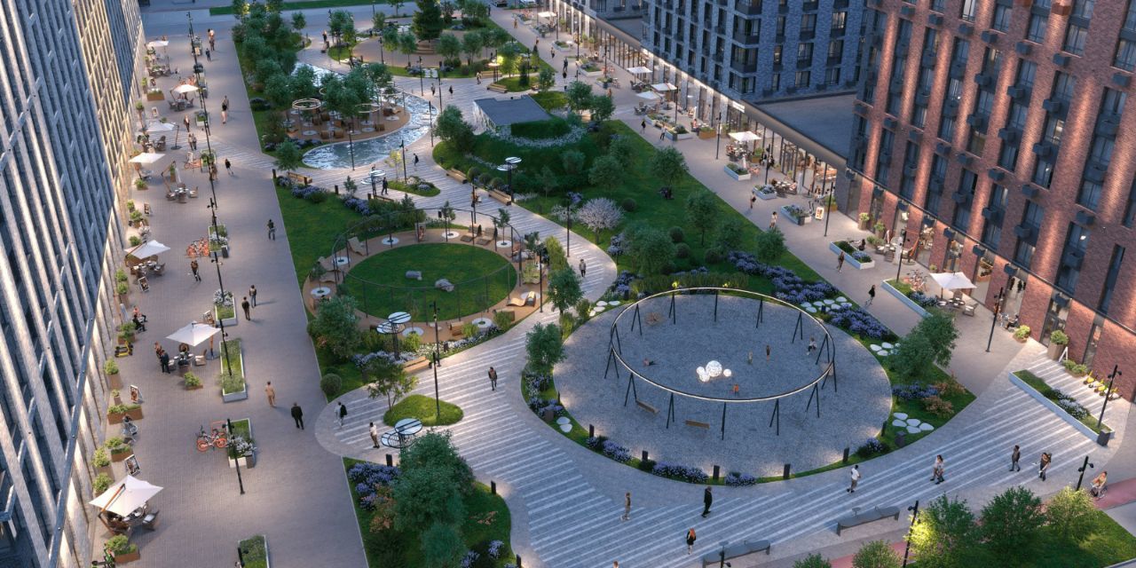 В проекте предусмотрели большую аллею с зонами отдыха, арт-объектами, искусственными водоемами и коммерческим кластером — ресторанами с летниками и крупными сетевыми магазинами.