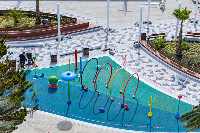 Проект включает создание теневых аэрариев, тематических зон с мягким покрытием для игр со скакалкой, оборудованием для настольного тенниса и водными аттракционами. Предусмотрены новые душевые, раздевалки, спасательные вышки, туалеты, медпункт. Специалисты установили видеонаблюдение и ячейки для хранения малогабаритных вещей. Сейчас на объекте укладывают резиновое покрытие и устанавливают теневой тент.
