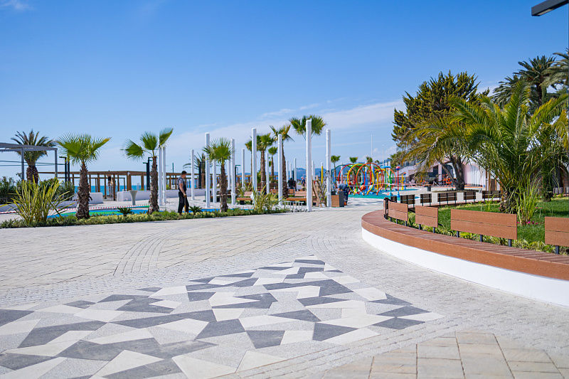 На территории заменили коммуникации, брусчатку, установили новую парковую мебель, малые архитектурные формы и освещение. Также на пляже высадили субтропические растения.