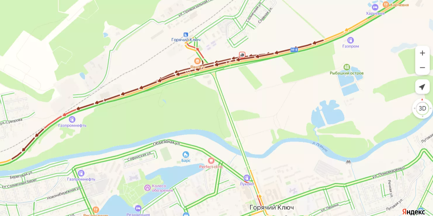 Самый большой затор в 6 км начинается от въезда в Горячий Ключ и заканчивается в районе улицы Новое Заречье.