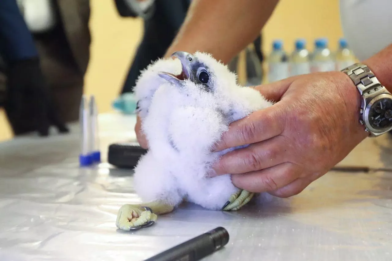 Птенцов кольцуют на третьей неделе, так как в этот период они могут перенести стресс и быстро восстановиться. На лапки ему закрепили небольшие кольца с цветовыми метками региона — красный цвет кольца на одной лапке и бело-зеленый на другой. После специалисты определили пол и присвоили номер. Птенец оказался самцом.