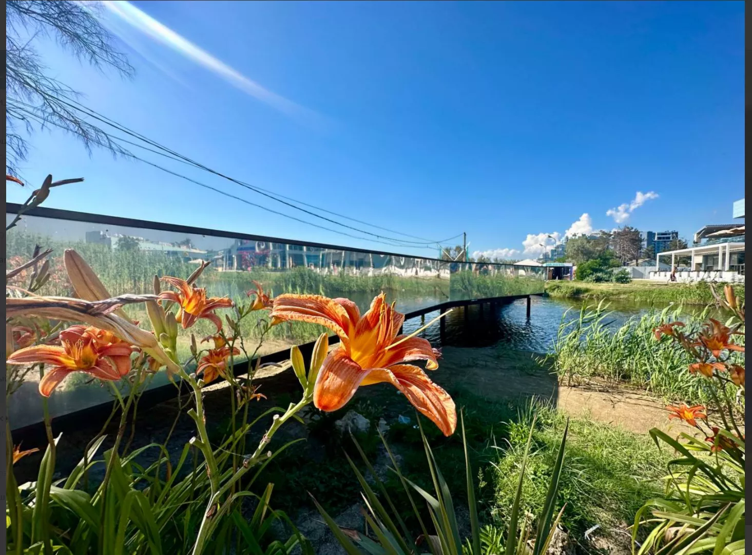 «Внутри сооружение обшито деревом, а снаружи — зеркальными панелями, отражающими пространство вокруг и создающими иллюзию продолжения моря, пляжа и реки».