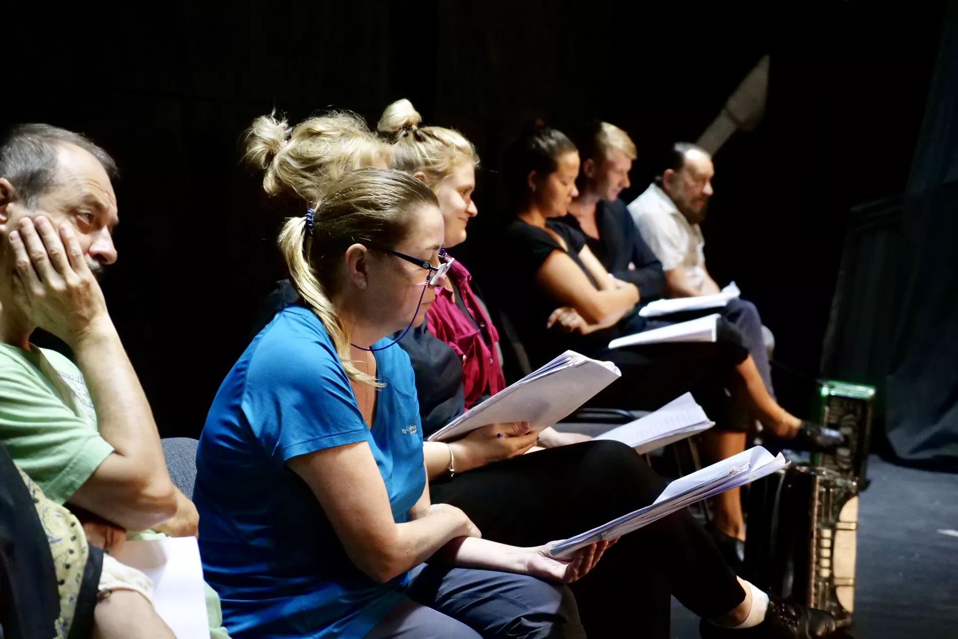 Творческое объединение «Аврора читает» представит эскиз «Чёрные страницы» по материалам экспедиции по кубанским хуторам и станицам, в которой участники общались с бабушками и дедушками и записывали их истории о прошлом. Детство и молодость героев спектакля выпали на времена войны и голода, но несмотря на это их память лучше сохранила истории любви, а о трагических событиях один из них говорит: «Все стёрлось само собой. Временем стёрлось».