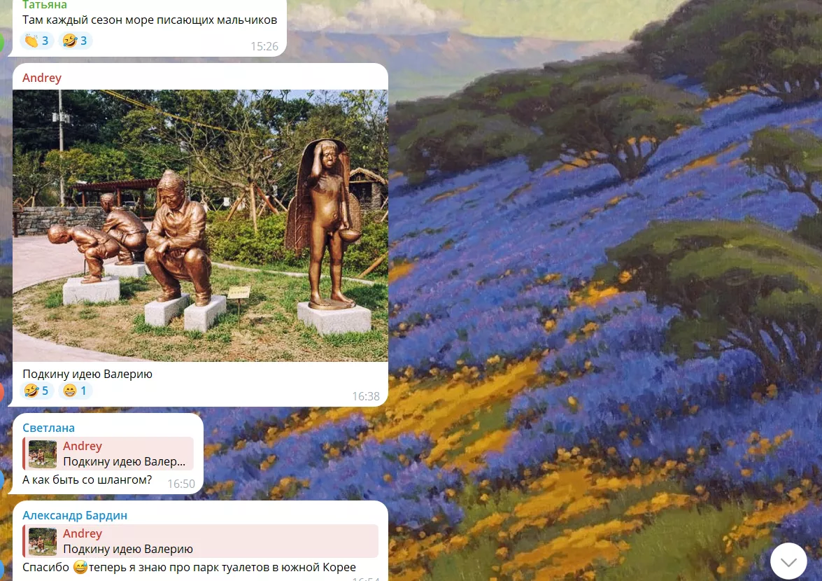— «Так, копию, почти копию писающего мальчика из Брюсселя установили. Осталось поставить копию какающего мужчины из Испании»