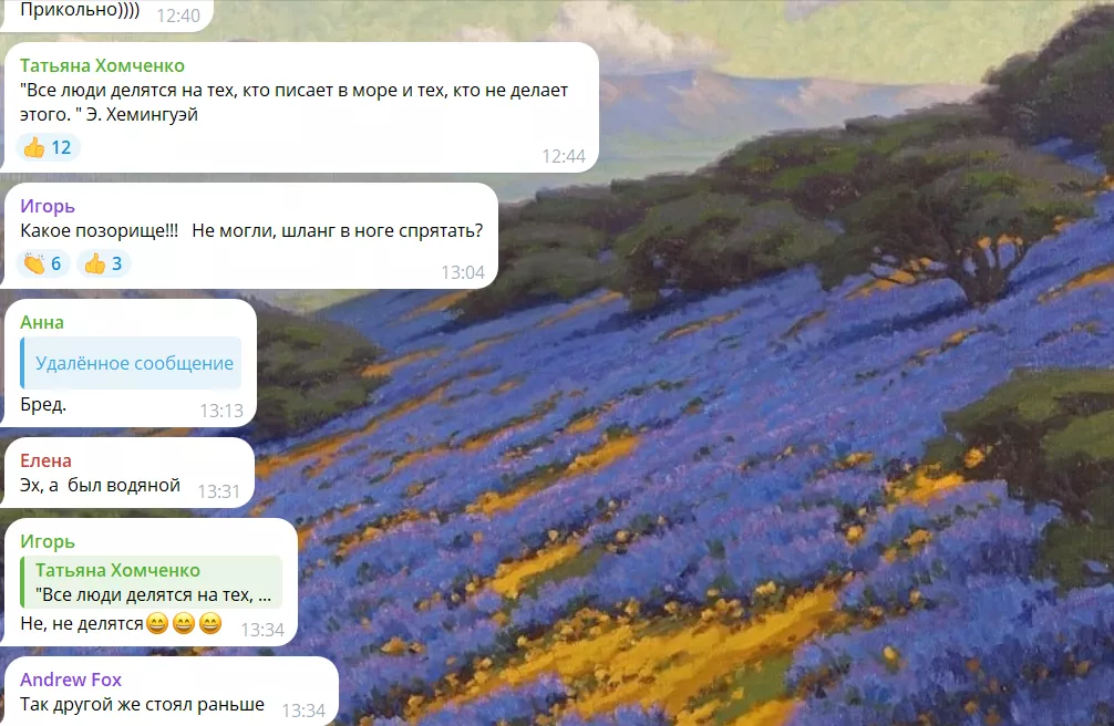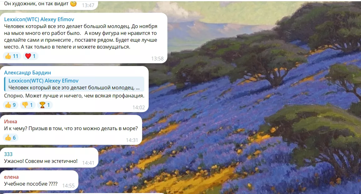 «Большинство купальщиков делают это именно в воду. А струя, направленная в Суджукскую лагуну, может подразумевать отношение людей к памятнику природы, возросшую на него антропогенную нагрузку. Возможно, речь о том, что люди ведут себя как этот маленький ребенок. Надо прямо здесь и сейчас удовлетворить физиологические потребности, и они делают это», — прокомментировало СМИ.