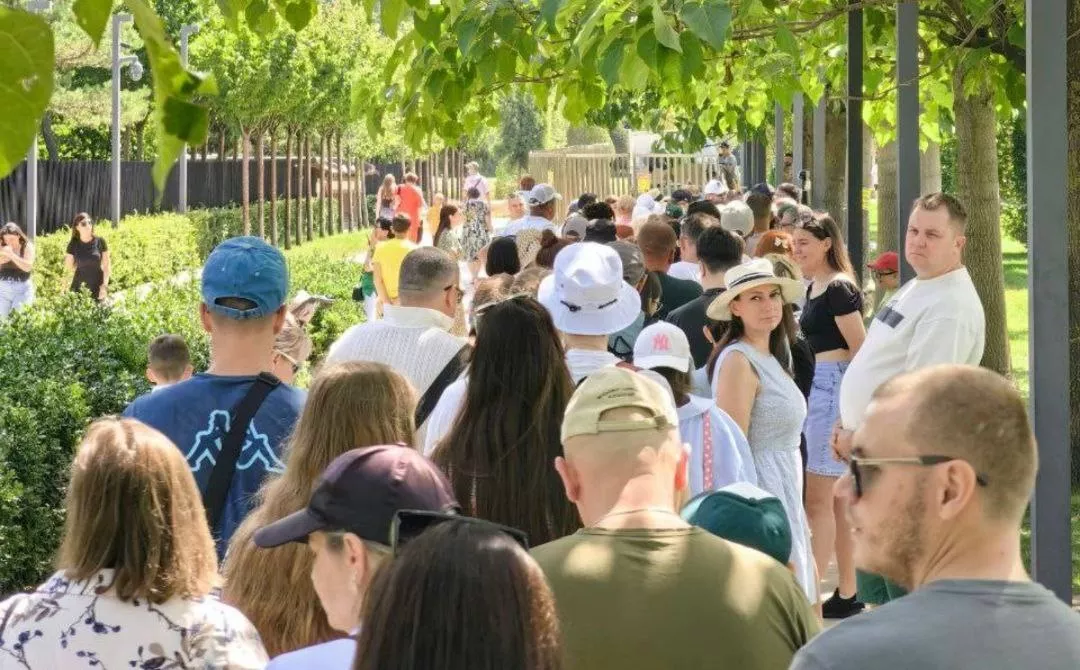 Автор видео пишет, что даже жаркая погода не испугала людей — они готовы к прогулке и долгому ожиданию при +36 градусах. Некоторые посетители парка стоят в очереди с маленькими детьми.