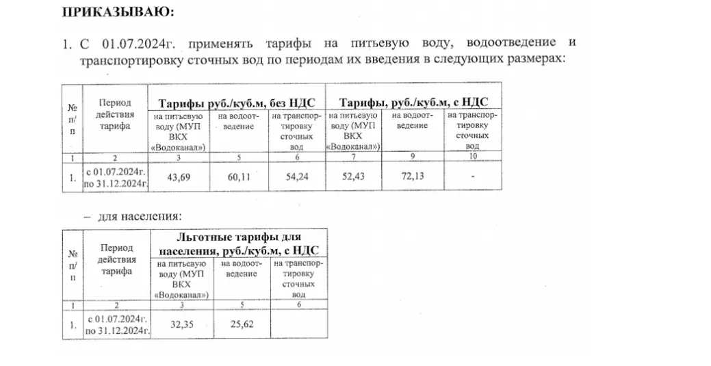 МУП ВКХ «Водоканал» опубликовал новые тарифы, которые вступают в силу 1 июля. Так, цену на питьевую воду увеличат на 64,3% — с 31,91 до 52,43 рублей с НДС.