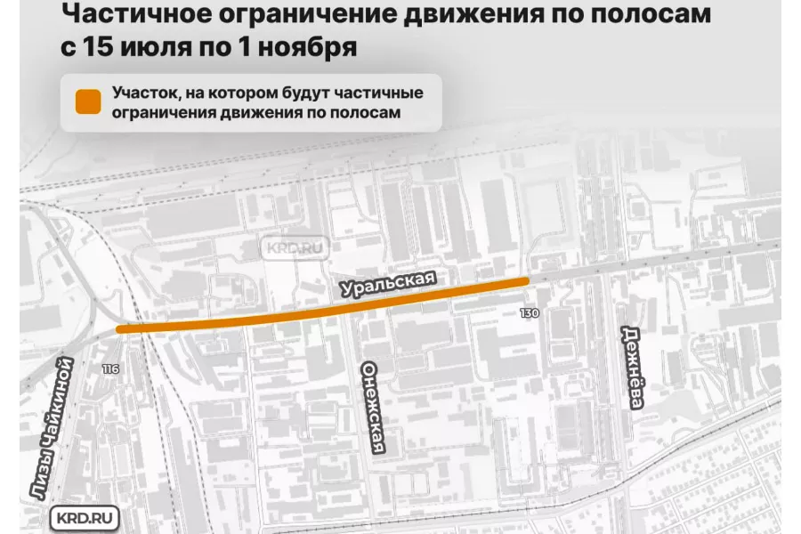 С 15 июля до 1 ноября для дорожного движения будут закрыты две полосы (по одной в каждом направлении) улицы Уральской от дома №116 до дома №130 — предупреждение об этом опубликовала пресс-служба администрации Краснодара.