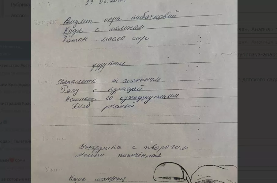 В телеграм-каналах Анапы появилось фото меню из детского сада «Колокольчик», написанное с ошибками