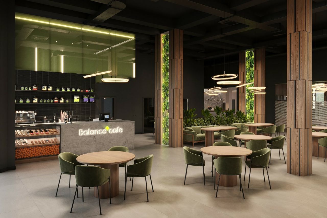 Интерьер клуба выполнят в экологическом стиле — с использованием натурального камня и дерева. На первом этаже будет просторное кафе, декорированное живыми растениями.