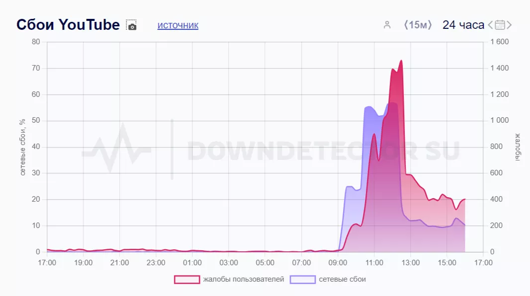 •  © Скриншот с сайта сервиса Downradar https://downdetector.su/youtube