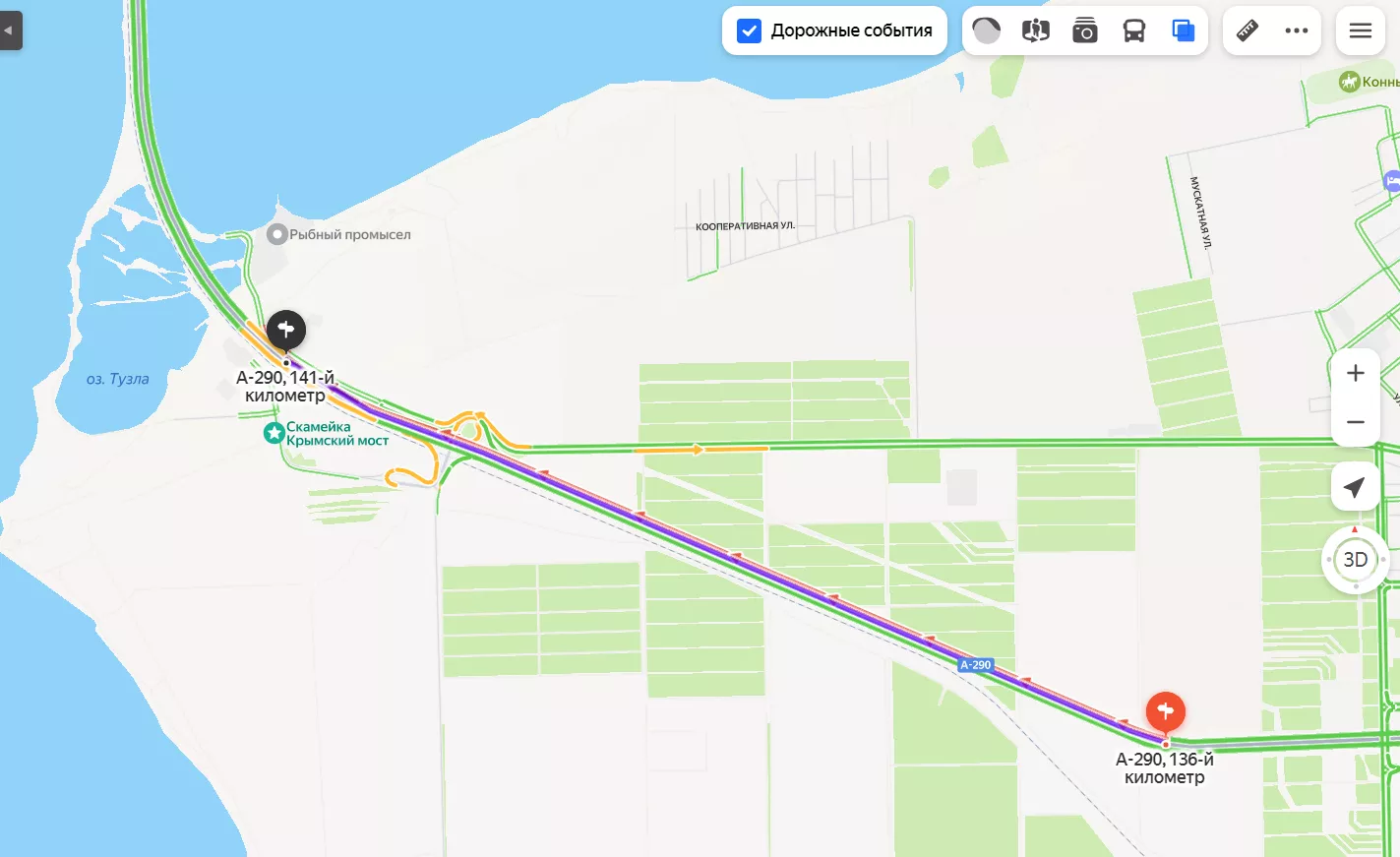 По данным сервиса «Яндекс Карты», затор на трассе Новороссийск — Керчь со стороны Тамани растянулся от 136 до 141 километра трассы А-290.