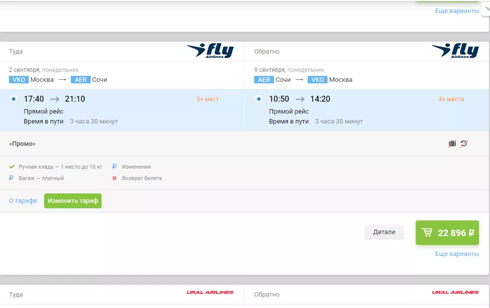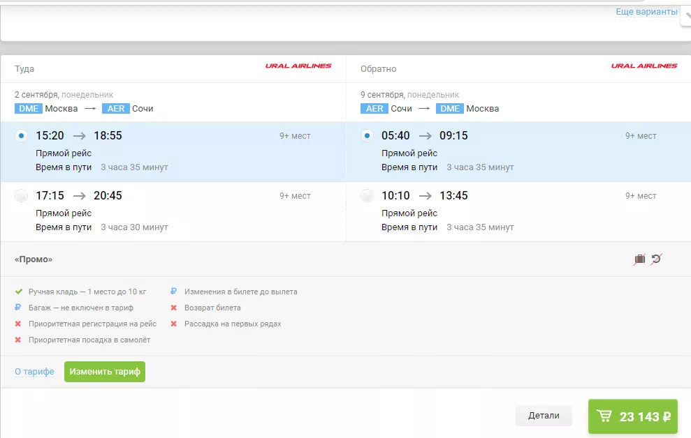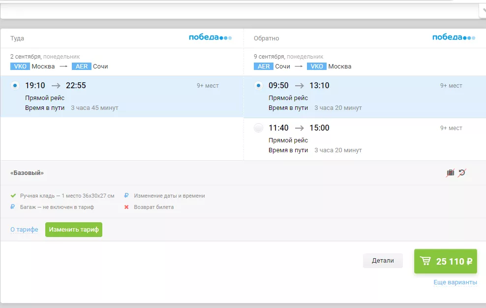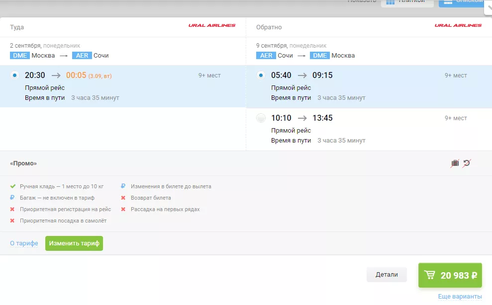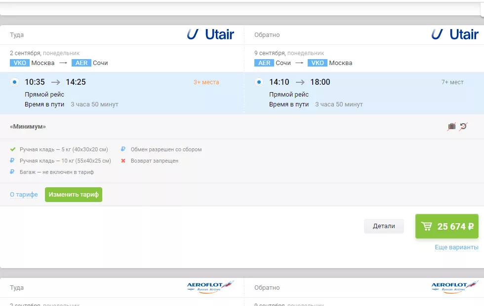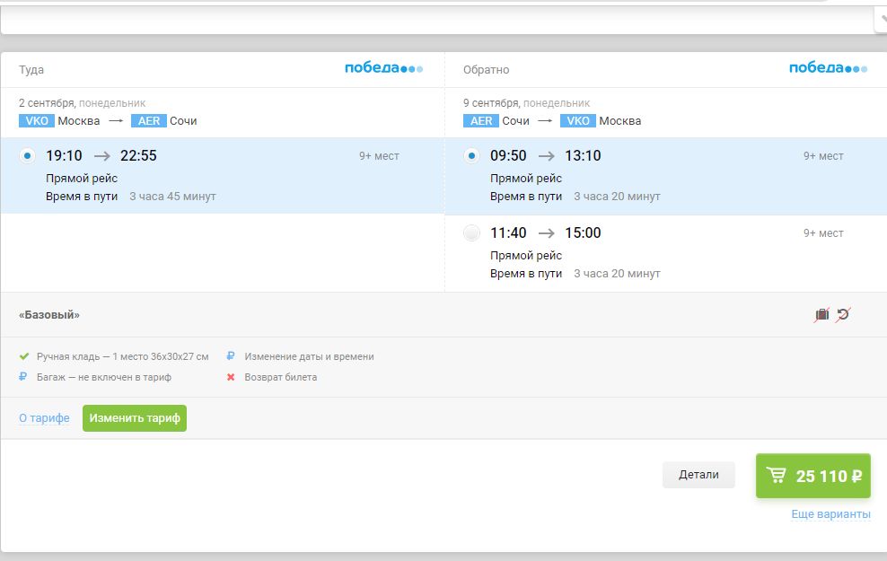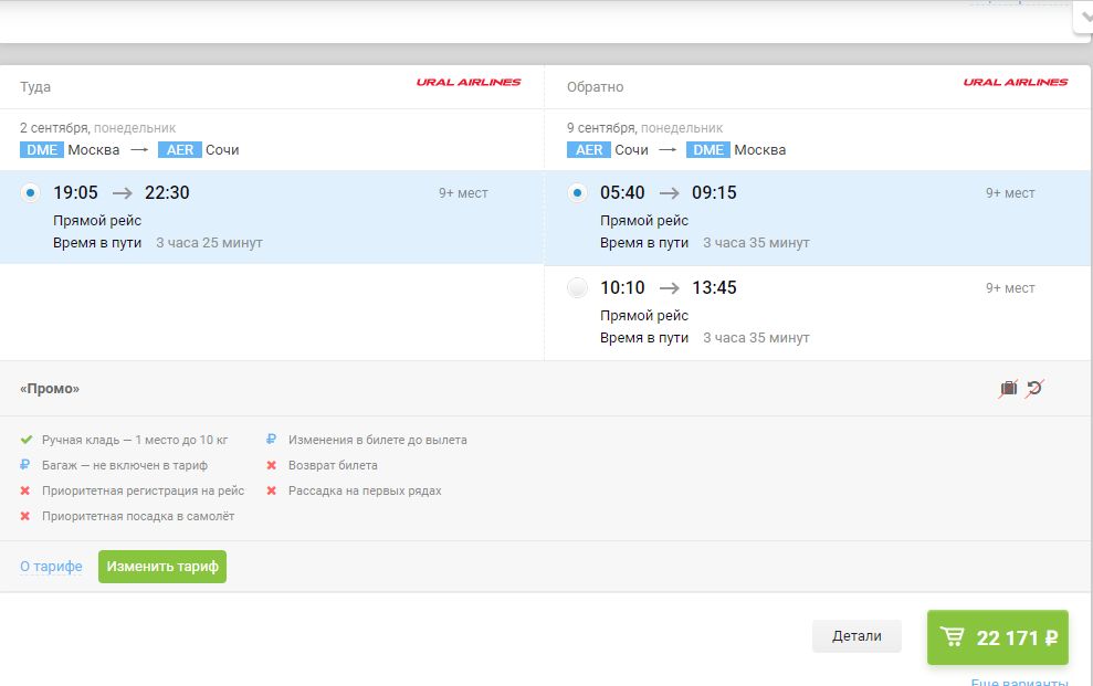 Билеты с багажом на рейс Москва-Сочи туда-обратно с вылетом 2 сентября и возвращением 9 сентября подешевели на 14% по сравнению с последними числами августа. Так, стоимость перелета начинается от 20 тыс. рублей (тариф без багажа).