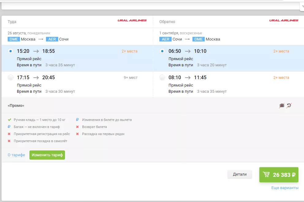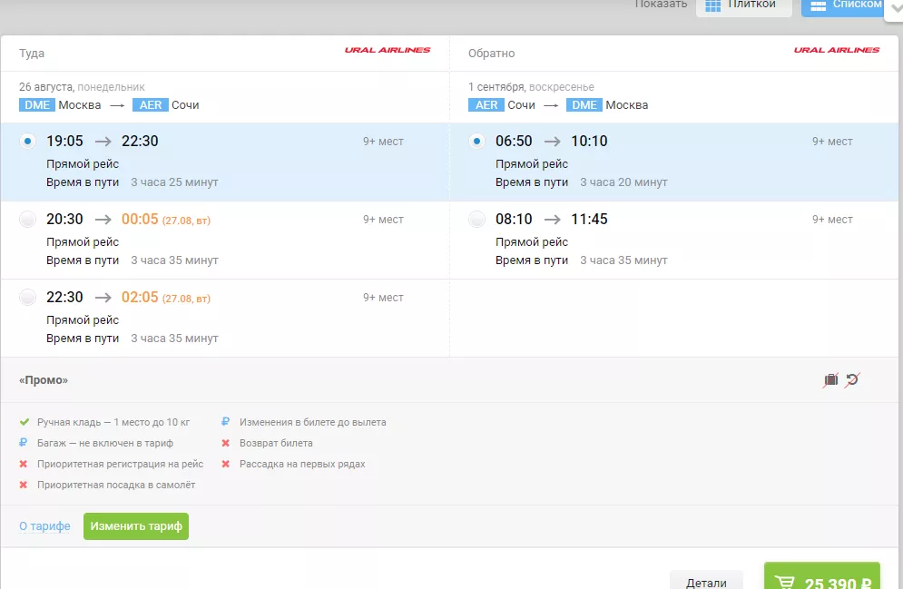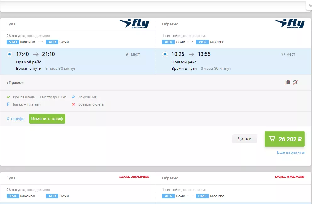 26 августа из Москвы в Сочи и обратно 1 сентября можно улетететь минимум за 25 тыс. рублей.