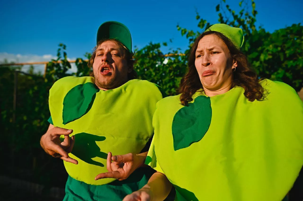 В спектакле задействованы три актера «Одного театра» — Дарья Женихова, Богдан Галась и Мария Ступченко, а также актер Молодежного театра Александр Теханович. Для рекламной афиши актеры снялись в костюмах разных фруктов и овощей — подписчики сравнили их образ с популярной рекламой «Фруктового сада».