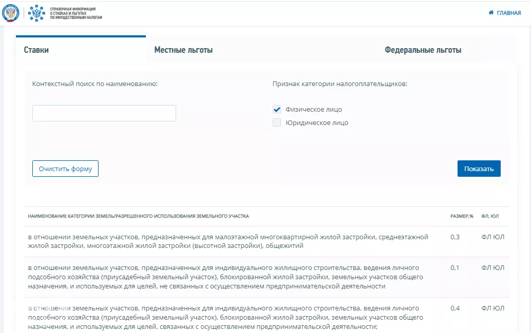 4. В открывшемся окне выбрать интересующую вкладку: «Ставки», «Местные льготы» и «Федеральные льготы». В «Ставках» указаны виды земельных участков с актуальным размером налога в процентах, а в «Льготах» — категории налогоплательщиков, причитающиеся им скидки, условия и основания их предоставления.