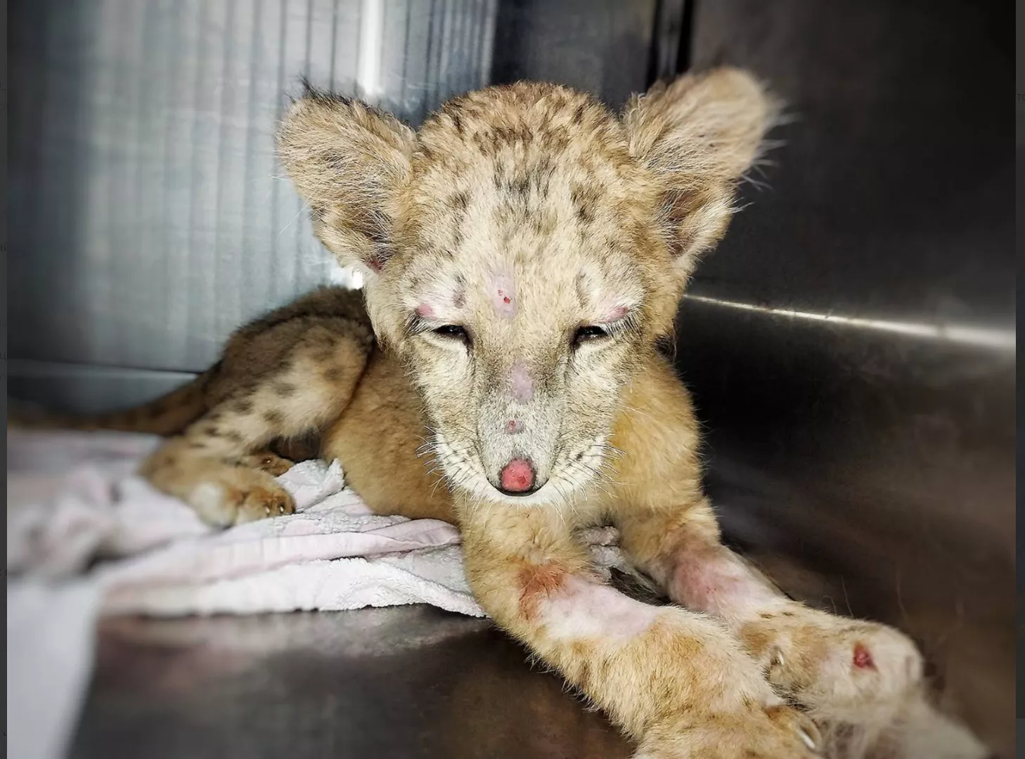 Волонтеры отправили львенка на лечение в Москву. У него сломаны передние лапы, животное в тяжелом состоянии