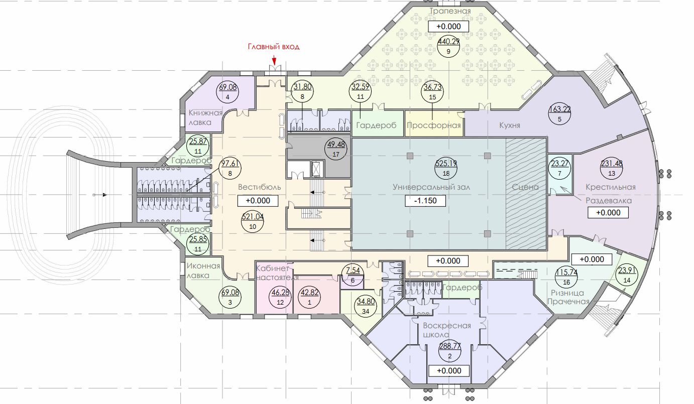Его разработала компания «Русская архитектура». Представлены пять изображений комплекса и схемы помещений. Общая площадь первого этажа храма составит 3 тыс. 25 кв. метров, второго — 1 тыс. 132 кв. метра. Почти 290 «квадратов» займет воскресная школа.