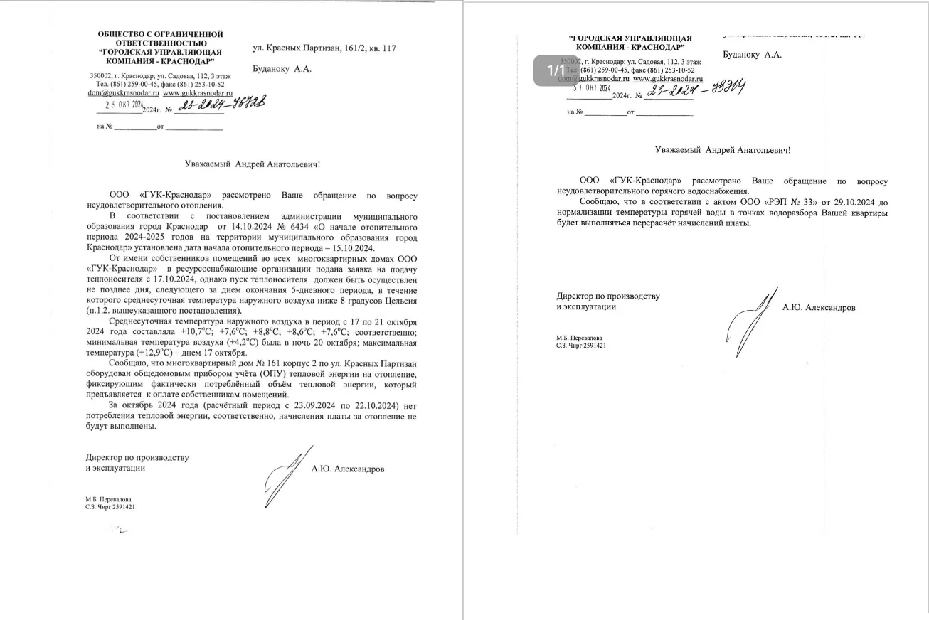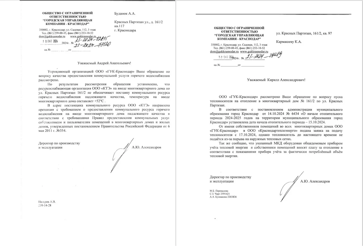 В ГУК краснодарцам ответили, что в адрес поставщика направили претензию с требованием дать горячую воду. Там же подтвердили, что отопления в доме нет из-за прорыва на наружных тепловых сетях. Также жители написали обращение в прокуратуру Прикубанского округа, однако еще не получили ответ от ведомства.