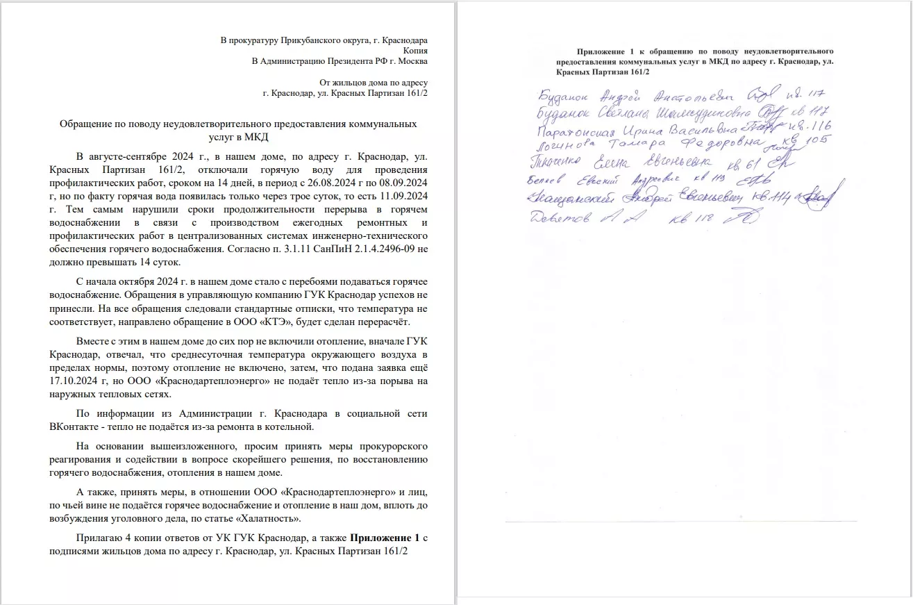 © Коллаж из скриншотов письма в прокуратуру Прикубанского округа Краснодара