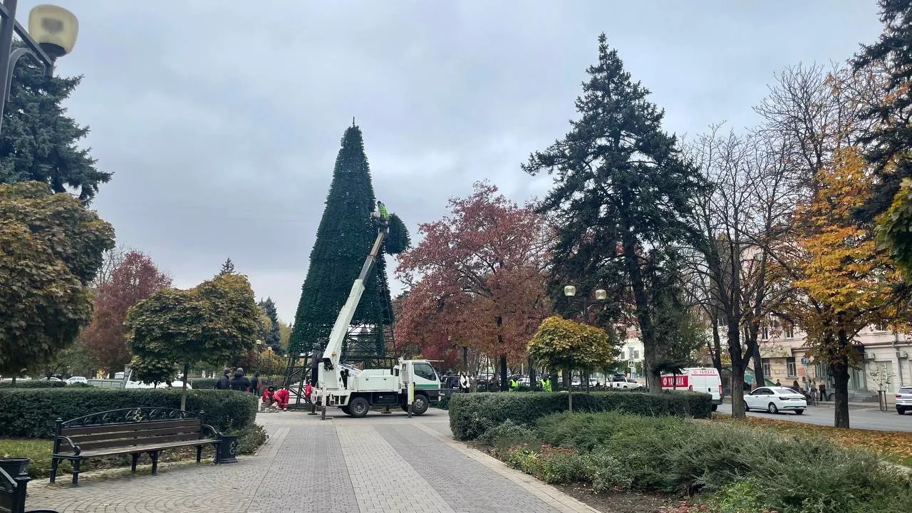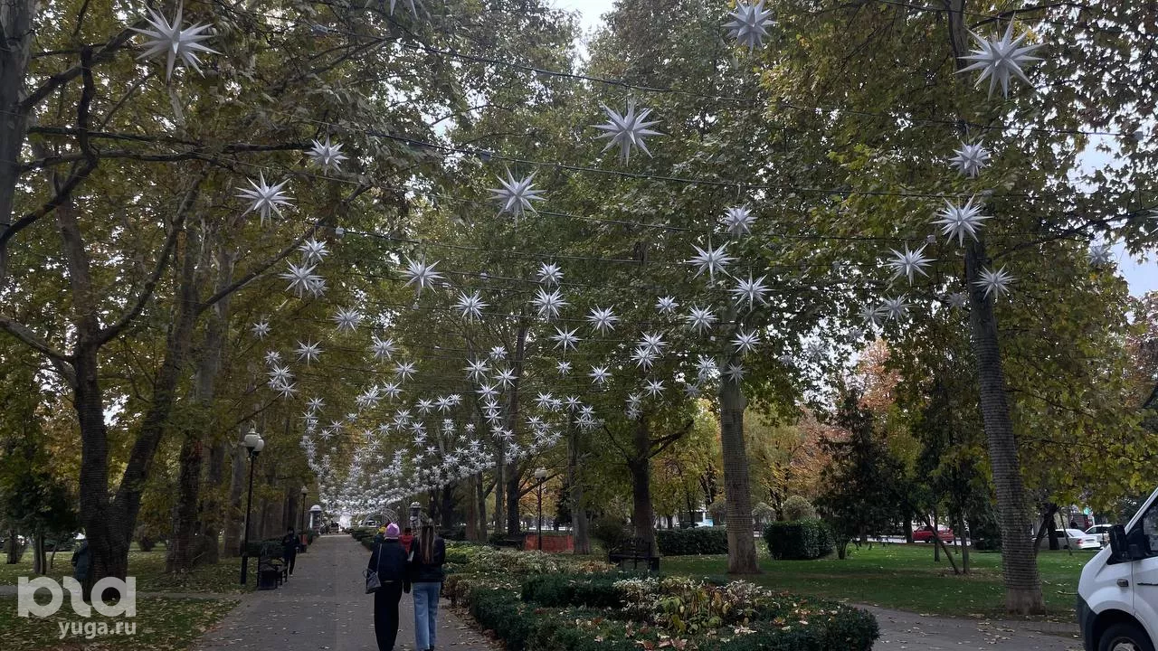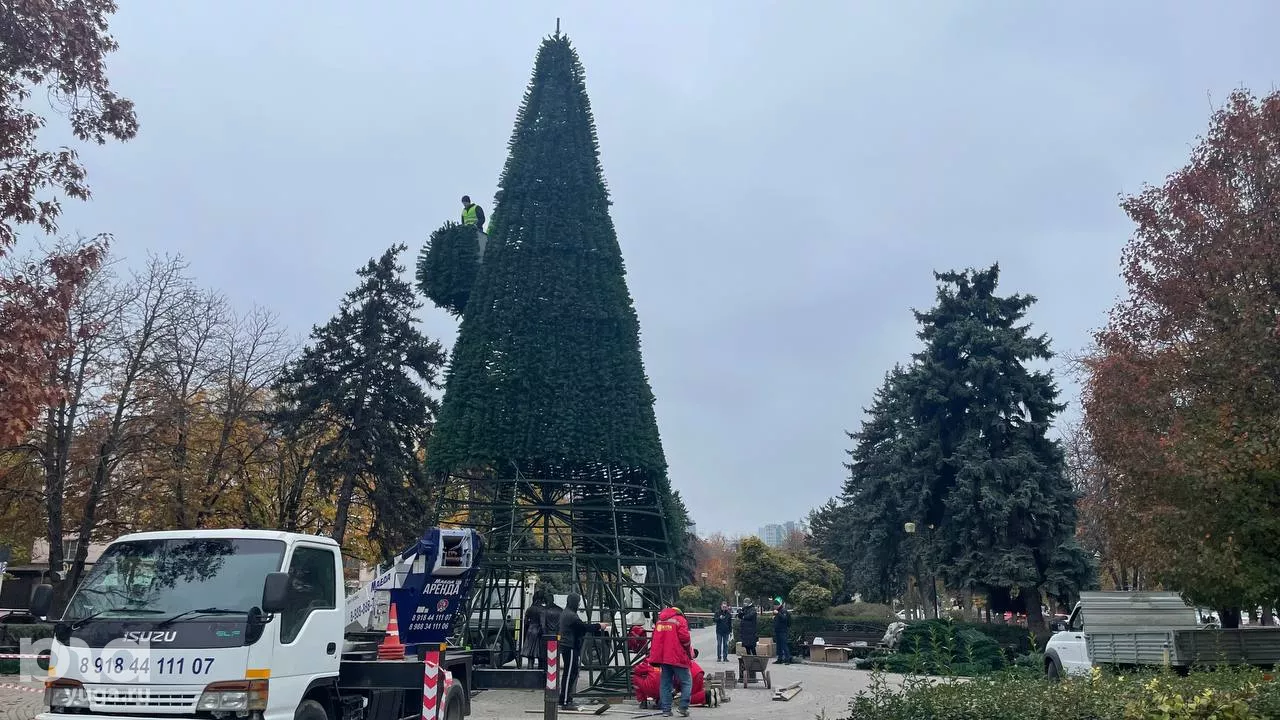 Краснодар продолжают украшать к Новому году. В центре города устанавливают первую елку