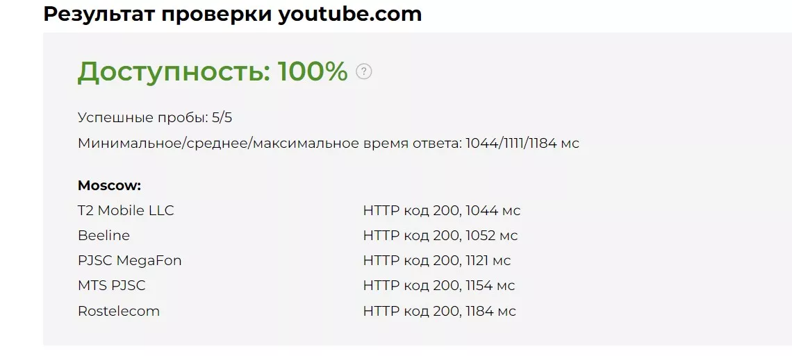 15 ноября, по данным сервиса мониторинга блокировок GlobalCheck, платформа YouTube на 100% доступна на территории России у всех мобильных операторов — «Билайна», «Т2», «МегаФона», МТС и «Ростелекома».