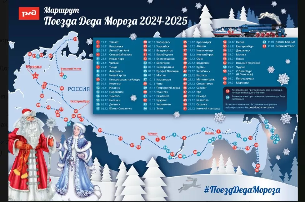 13 ноября телеграм-канал «Поезд Деда Мороза» сообщил, что волшебник отправился на поезде из Великого Устюга в путешествие по России. Оно продлится 60 дней до 11 января 2025 года.