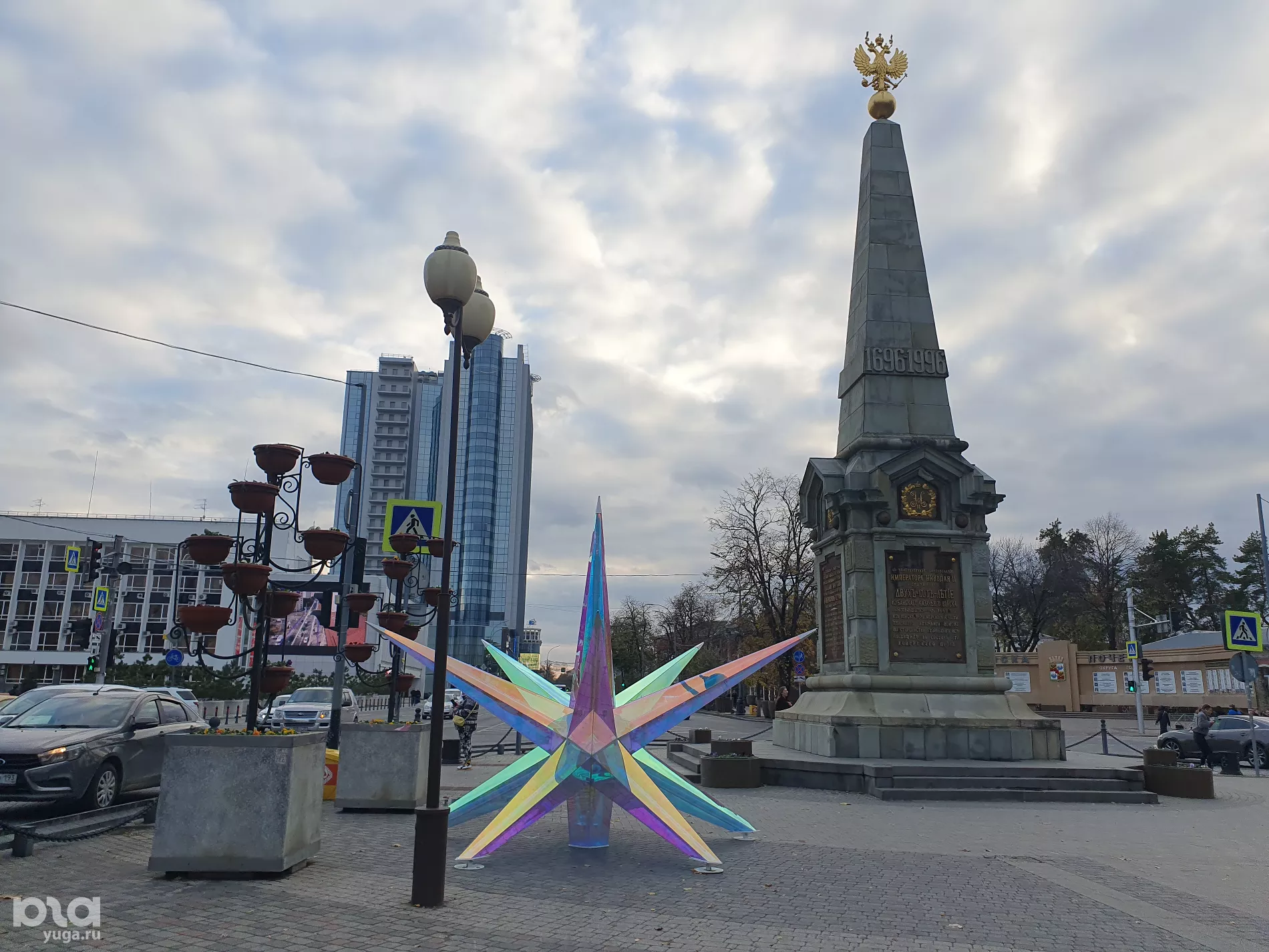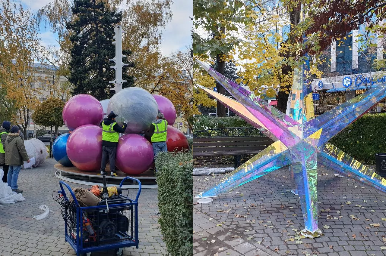 В центре Краснодара установили голографические звезды и елку из разноцветных шаров
