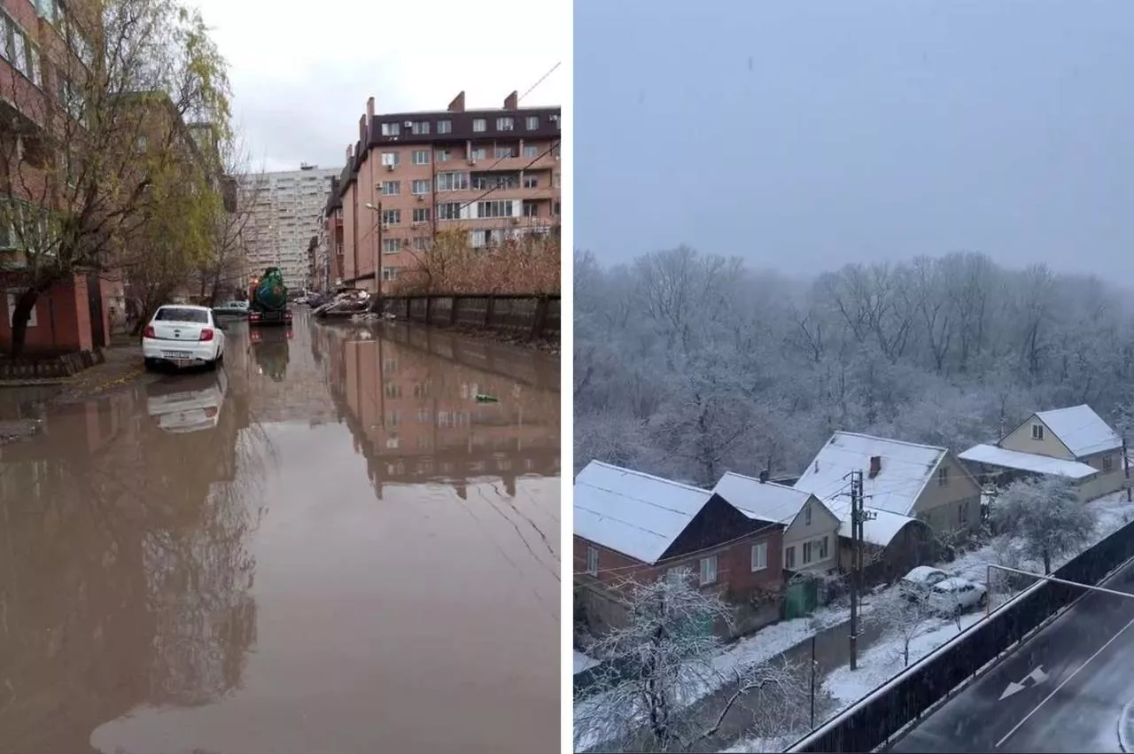 Некоторые районы Кубани засыпало снегом, а улицы Краснодара затопило после дождя. Собрали кадры из соцсетей