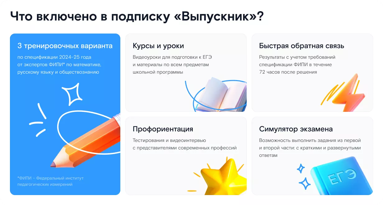 В подписку входит доступ к видеоурокам для подготовки к госэкзаменам по русскому языку, математике профильного уровня и обществознанию. По каждому из этих предметов один раз в месяц можно решать актуальные на 2024–2025 учебный год варианты заданий, разработанные Федеральным институтом педагогических измерений (ФИПИ). Развернутые ответы проверят члены предметных комиссий ЕГЭ.