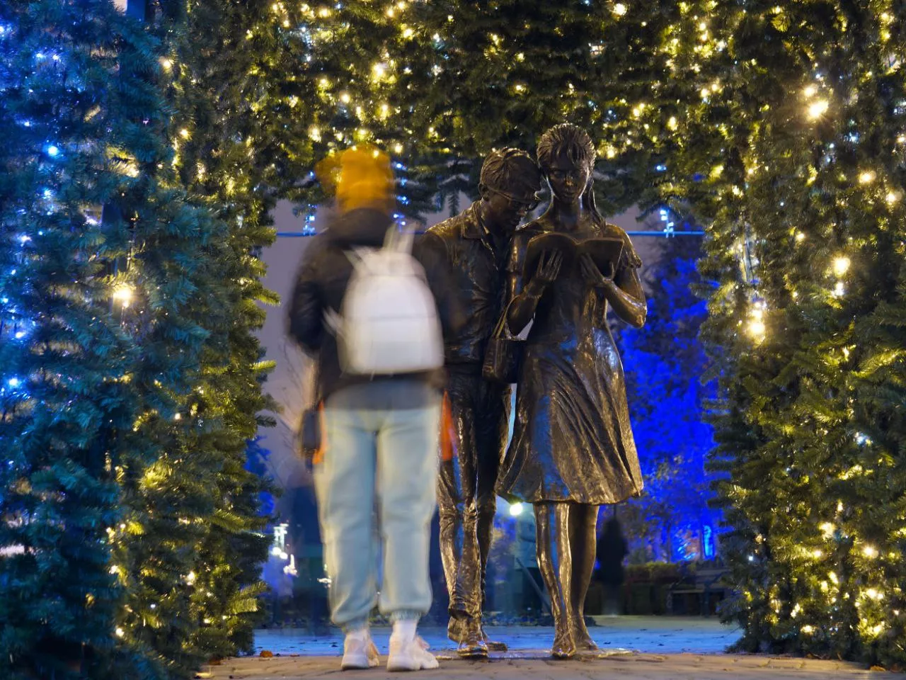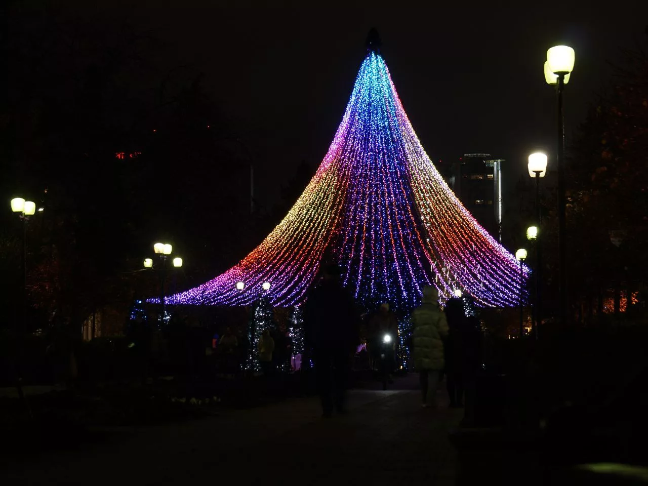 А это первая краснодарская новогодняя елка со светящимся «покрывалом», которую возвели над памятником Шурику и Лидочке. Она переливается зеленым, красным, синим и фиолетовым цветами.