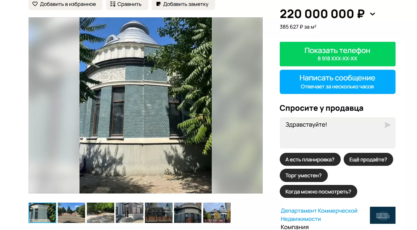 В Краснодаре выставили на продажу исторический особняк Фотиади. Информация появилась на популярном сайте объявлений. Здание в центре города площадью 570 кв. метров на улице Ленина, 53 оценили в 220 млн рублей.