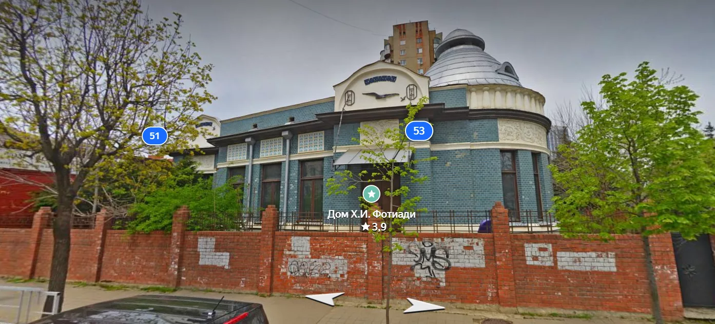 Дом Xристофopа Фoтиади на улице Соборной (сегодня Ленина) построили в 1912 году по проекту Алeксaндpа Kозловa. Стены расписал академик живописи Роман Колесников. Фотиади был обувным магнатом.