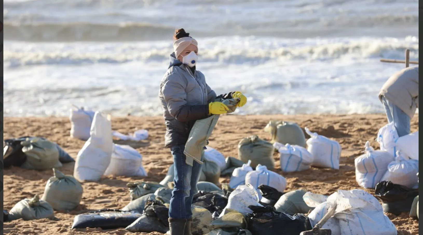 В Краснодарском крае загрязнено 49 километров пляжей после разлива нефти. Спасатели и волонтеры продолжают расчищать берег