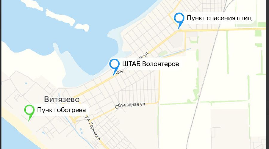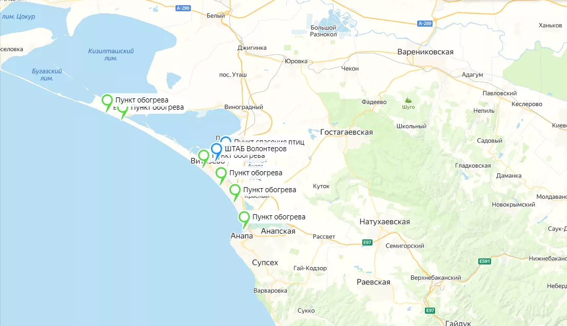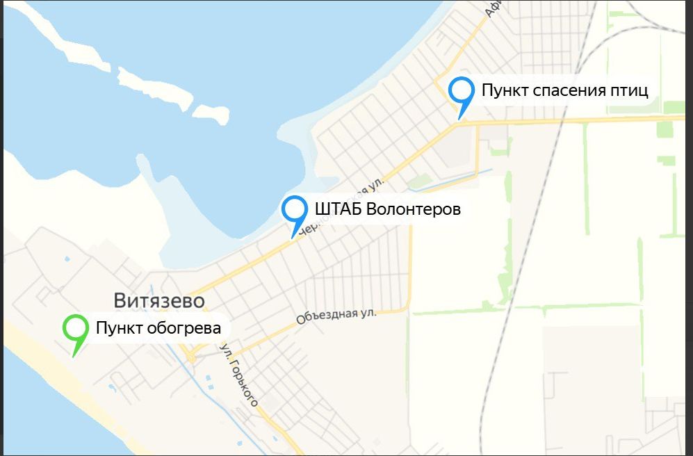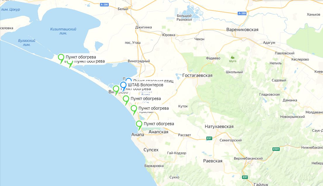 На карте отмечены волонтерский штаб (село Витязеов, улица Черноморская, 120), пункта спасения птиц (село Витязево, улица Черноморская, 2) и шесть мест обогрева, где можно отдохнуть и согреться горячим чаем. По мере развития событий на карту будут оперативно добавлять новые объекты.