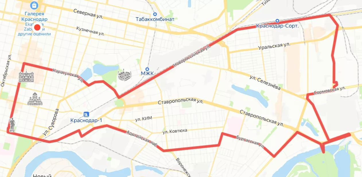 Круговой маршрут протяженностью 22 километра пройдет через улицы Постовую, Ставропольскую, Адыгейскую набережную, Старокубанскую, Трамвайную, Лизы Чайкиной, Новороссийскую, Карасунскую и Красную.