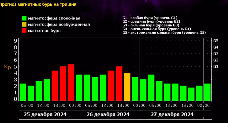 В связи с этим, согласно прогнозу на сайте лаборатории солнечной астрономии, 25 декабря с 15:00 до полуночи Землю накроет девятичасовая магнитная буря. Она может достигнуть уровня G2.