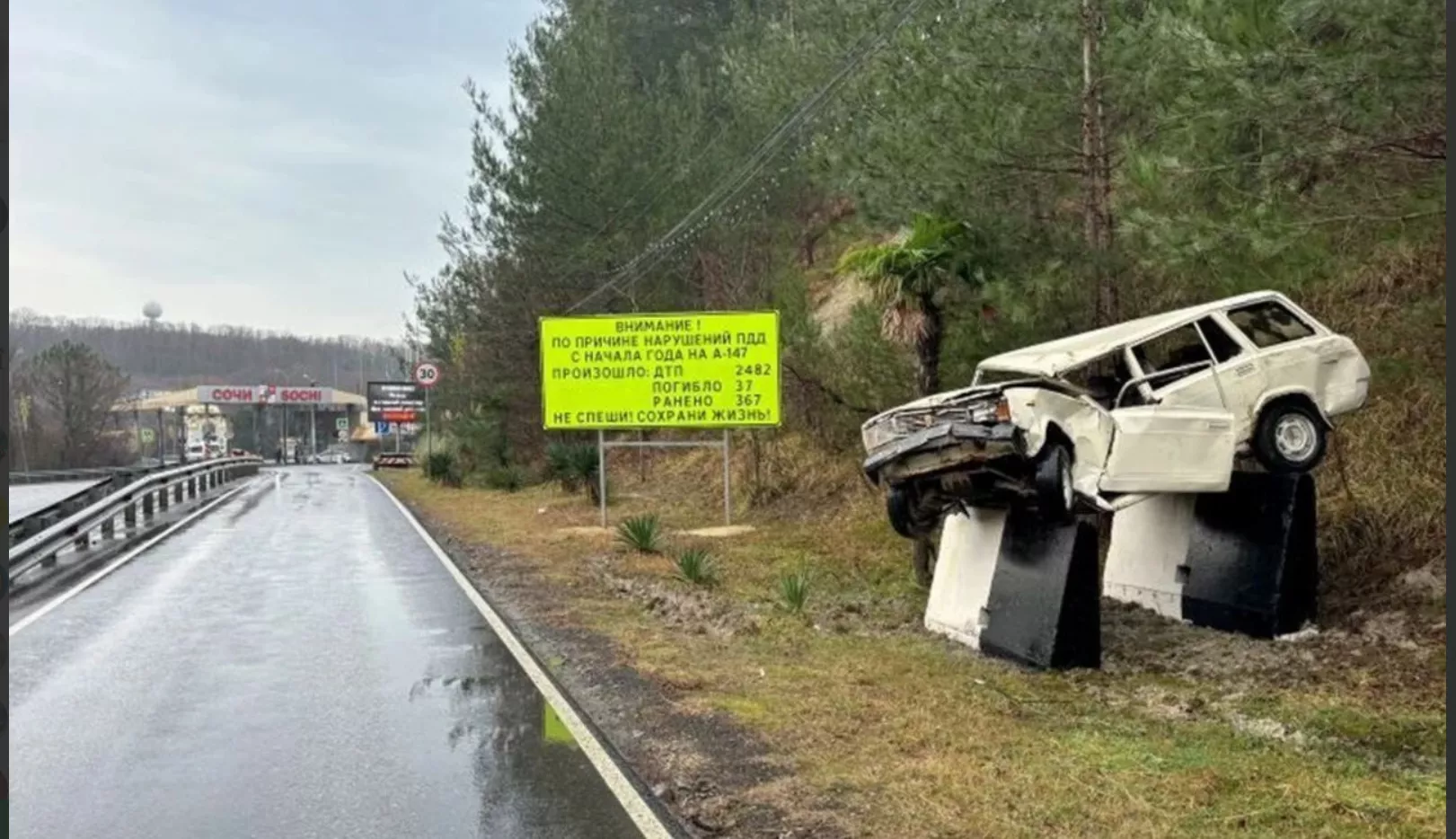14 января пресс-служба ФКУ Упрдор «Черноморье» сообщила, что на 80-м километре федеральной трассы А-147 Джубга — Сочи появился необычный «Монумент невнимательности». Он представляет собой пострадавший в ДТП автомобиль.