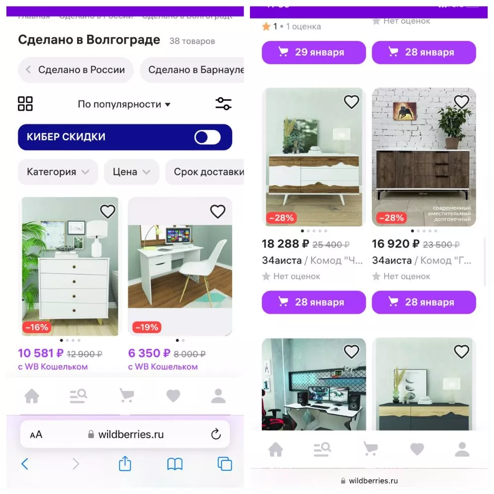 В разделе «Сделано в России» можно найти товары из Барнаула, Воронежа, Иваново, Карелии, Красногорска, Мордовии, Мурманска, Новосибирска, Твери, Югры. Также витрины запустили в Ростове-на-Дону и Волгограде. В разделе первого региона пока представлена только одежда, а второго — мебель.