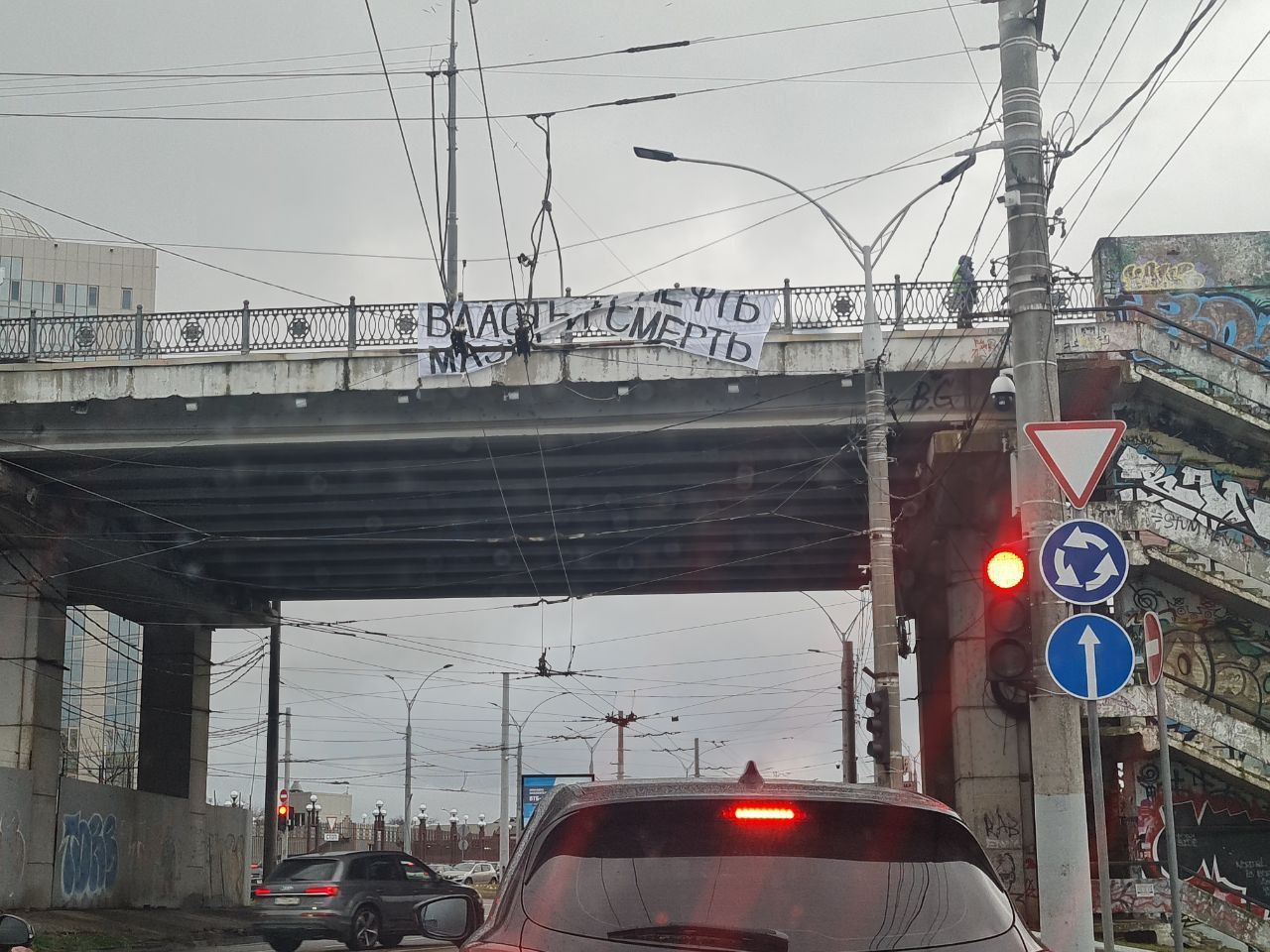 Утром 4 февраля в редакцию Юга.ру прислали фотографию, сделанную в Краснодаре на улице Кожевенной. На Тургневском мосту кто-то разместил баннер с надписью «Власть и нефть / мазут и смерть».