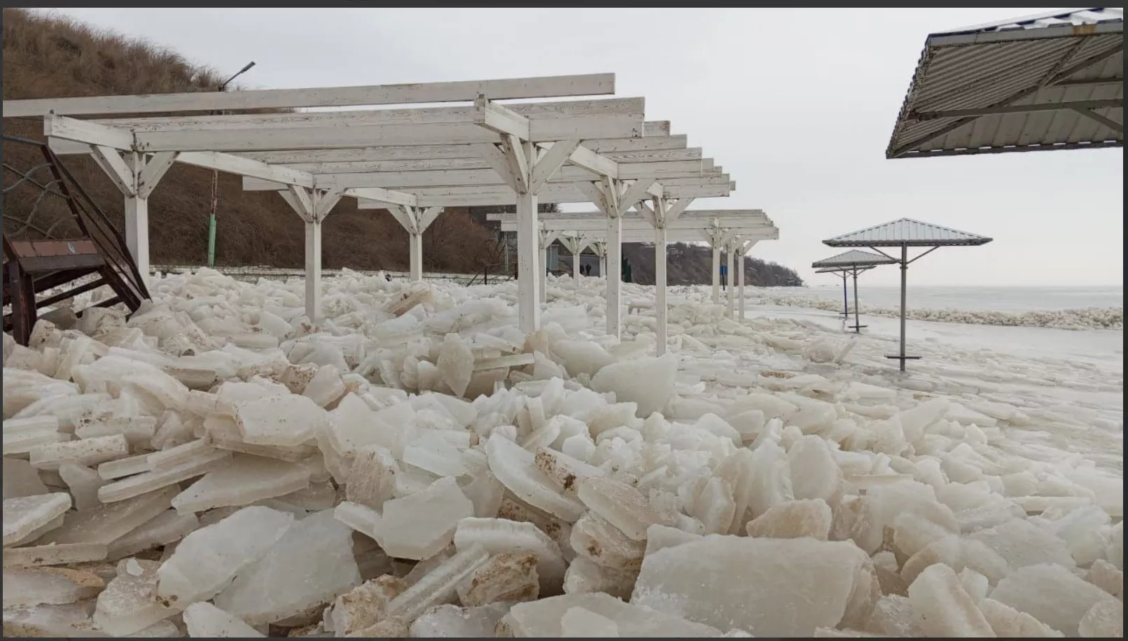 В этот раз причиной разрушений инфраструктуры на пляже стал «ледяной шторм». Он повредил лавочки, урны и душевую кабину.