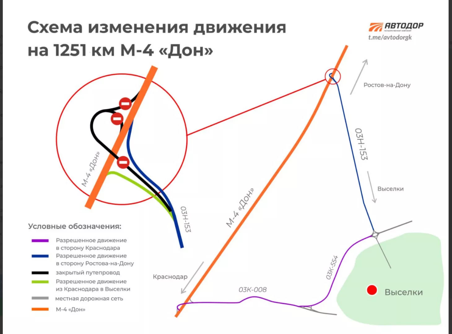 «Автомобилисты смогут воспользоваться временной схемой объезда. Движение со стороны Ростова-на-Дону в сторону станицы Выселки будет осуществляться через развязку на 1258 км, а в направлении Краснодара — по местной дороге через кольцевую развязку», — говорится в сообщении.
