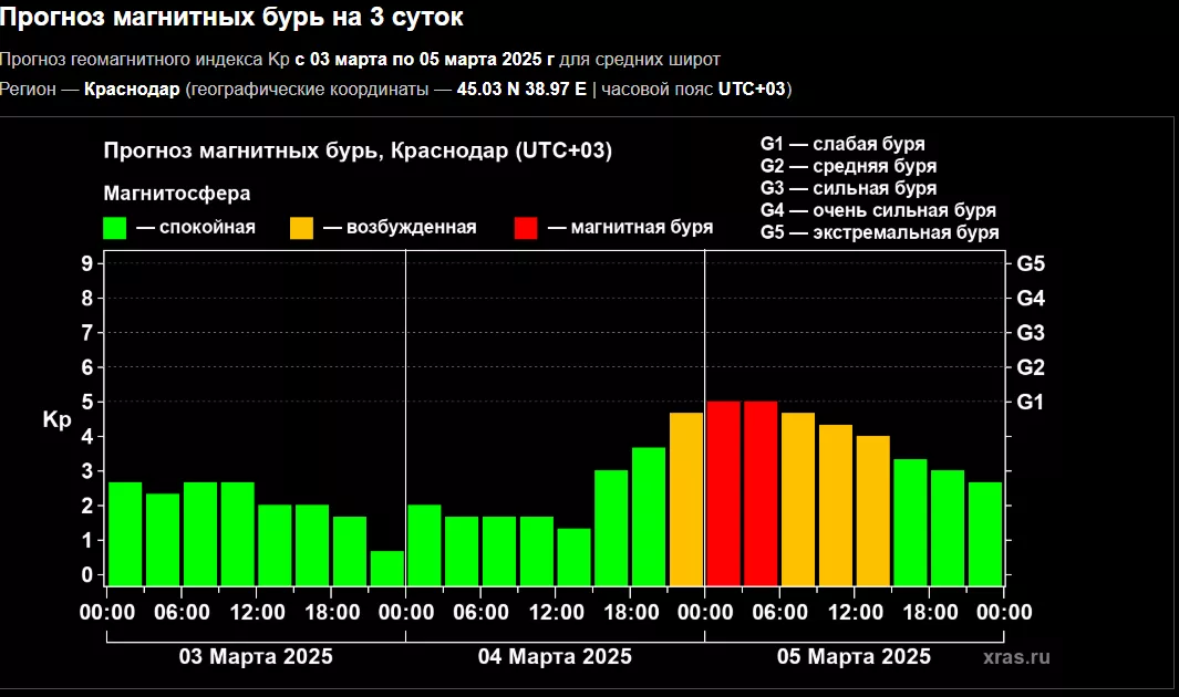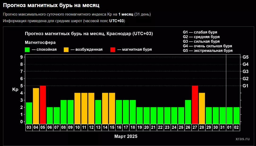 Также в прогнозе говорится, что магнитные бури ожидаются с 10 по 12 марта, 14–15 марта и 27–28 марта.