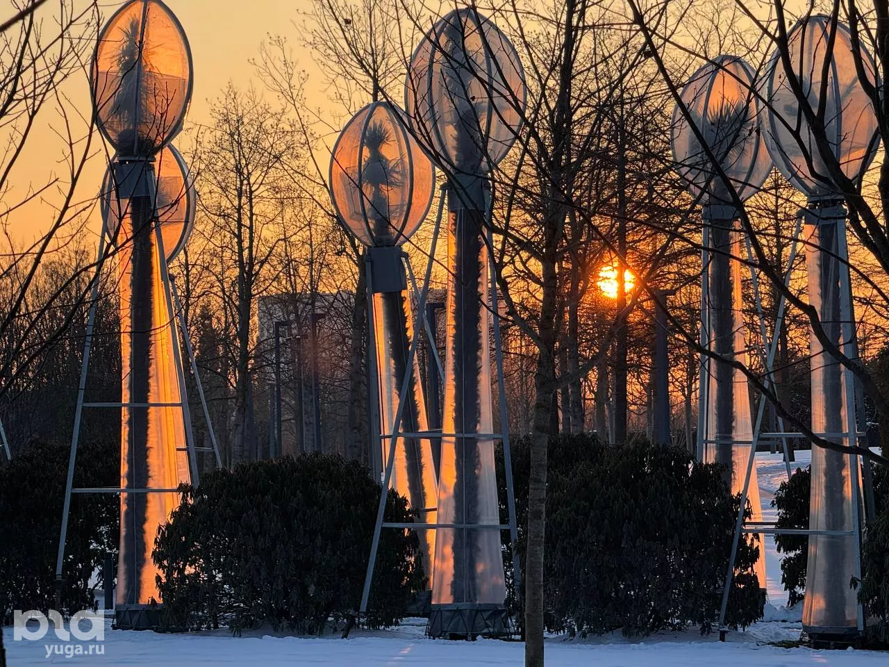 Теплолюбивые деревья в парке «Краснодар» укрывают от холодов специальными конструкциями, похожими на скафандры или тубусы. Это происходит каждый год с наступлением холодов в ноябре–декабре. Так для деревьев сохраняют привычный микроклимат.