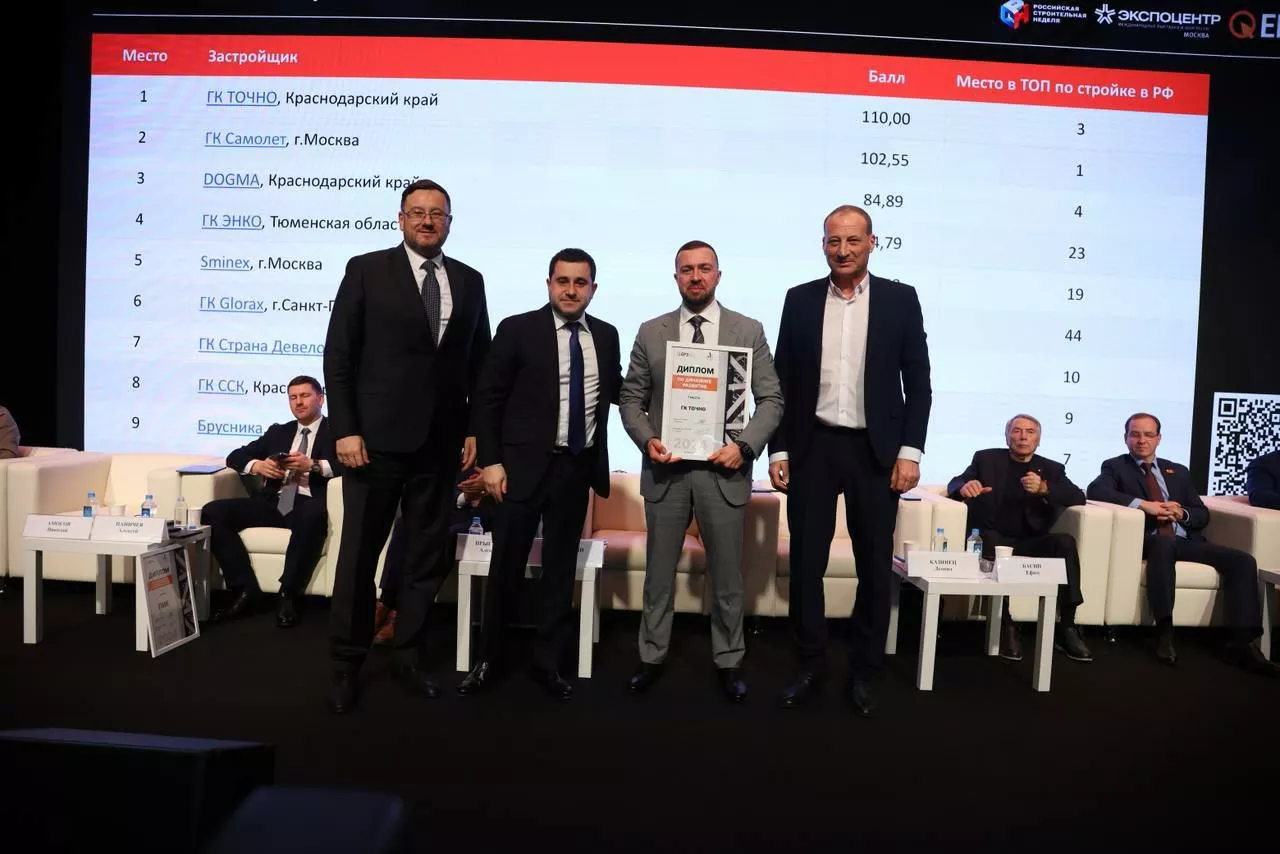 Замминстра строительства и ЖКХ РФ Никита Стасишин вручил Николаю Амосову специальный диплом «ГК ТОЧНО — самый динамично развивающийся застройщик России по итогам 2024 года». В церемонии поучаствовали также руководитель ЕРЗ.РФ Кирилл Холопик и президент Национального объединения застройщиков жилья Леонид Казинец.