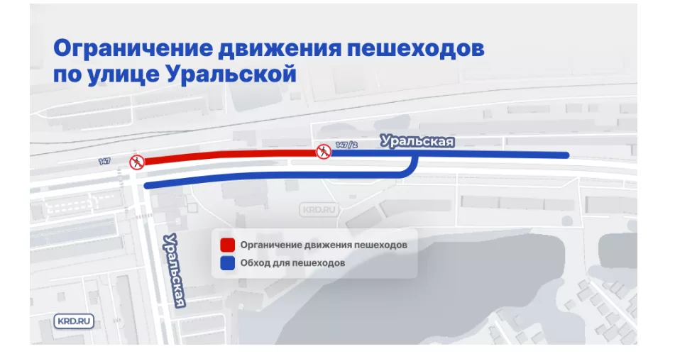 В начале июня специалисты будут возводить надземную часть перехода. Для этого ограничат движение пешеходов по улице Уральской от дома № 147 (въезд в гаражный кооператив) до дома № 147/2 со стороны въезда в город.