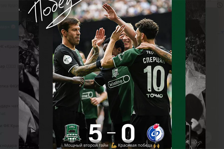 5:0 — самая крупная для «Краснодара» победа в чемпионате-2024/25. Набрав 49 очков, «быки» продолжают единолично лидировать в чемпионате, У «Спартака» после сегодняшней ничьей с «Ахматом» 44 очка. У «Зенита» 43 и матч в запасе. Следующий матч краснодарская команда проведет 5 апреля и снова дома. Соперником будет тольяттинский «Акрон».