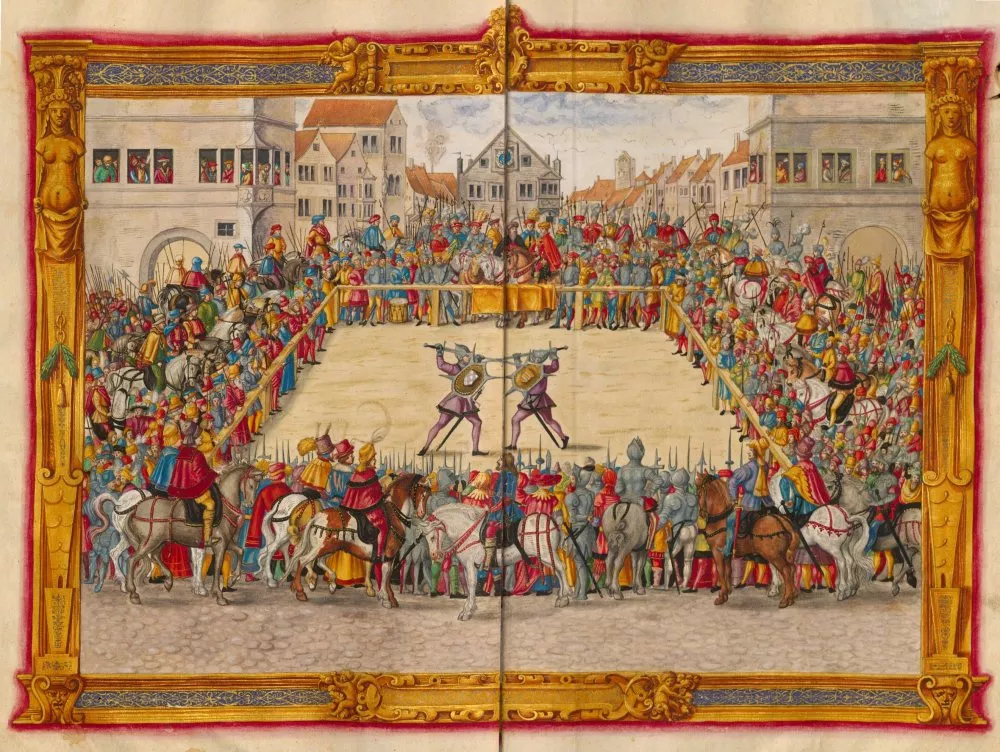 Судебный поединок в Аугсбурге (1409), рисунок Йёрга Броя младшего из фехтовального трактата Пауля Гектора Майра, около 1544 года © Изображение является общественным достоянием