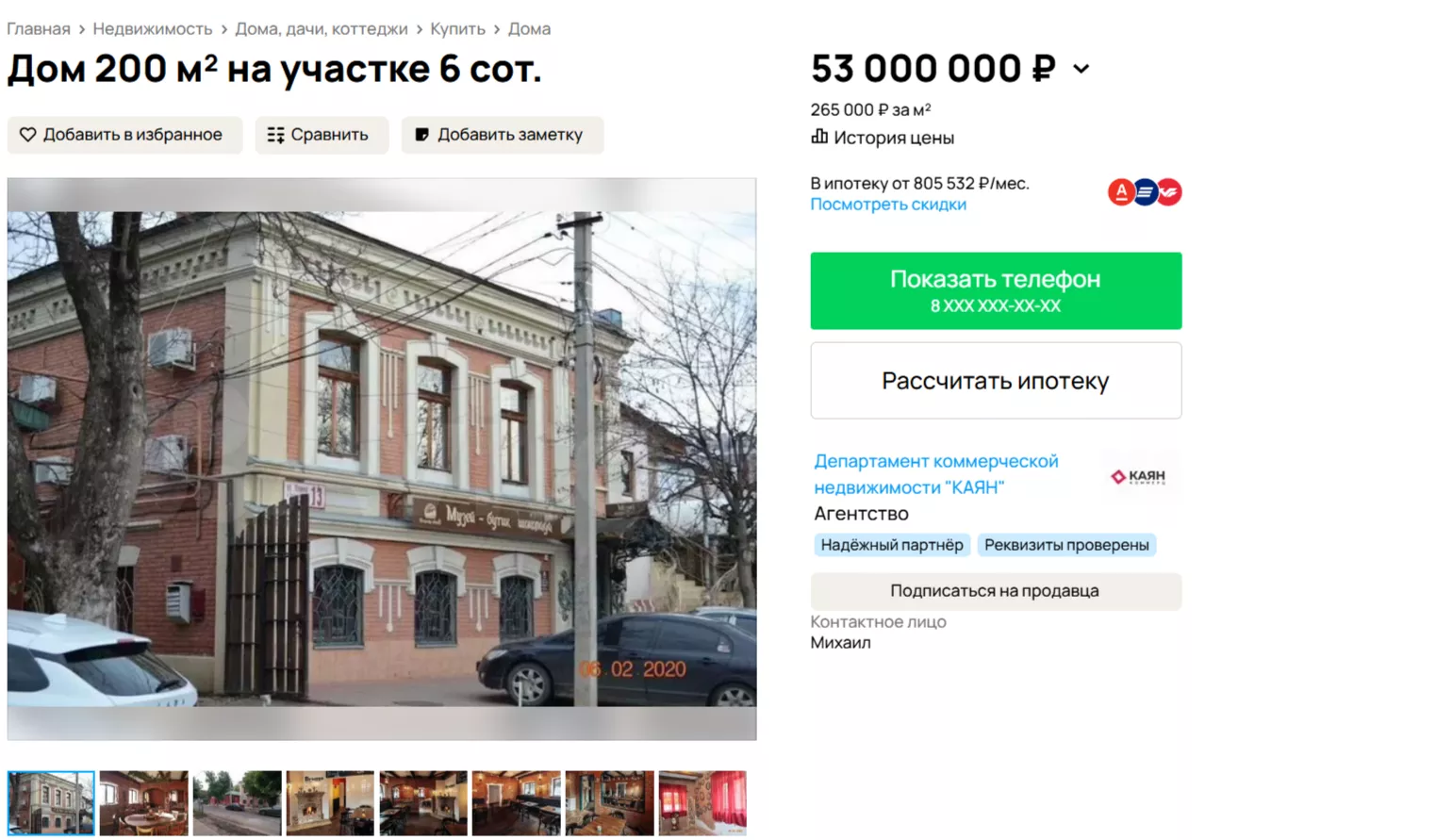 На популярном сайте объявлений появилась информация о продаже двухэтажного особняка конца ХIХ века. Дом находится в центре Краснодара на улице Ленина, 13. Здание площадью 200 кв. метров оценили в 53 млн рублей.